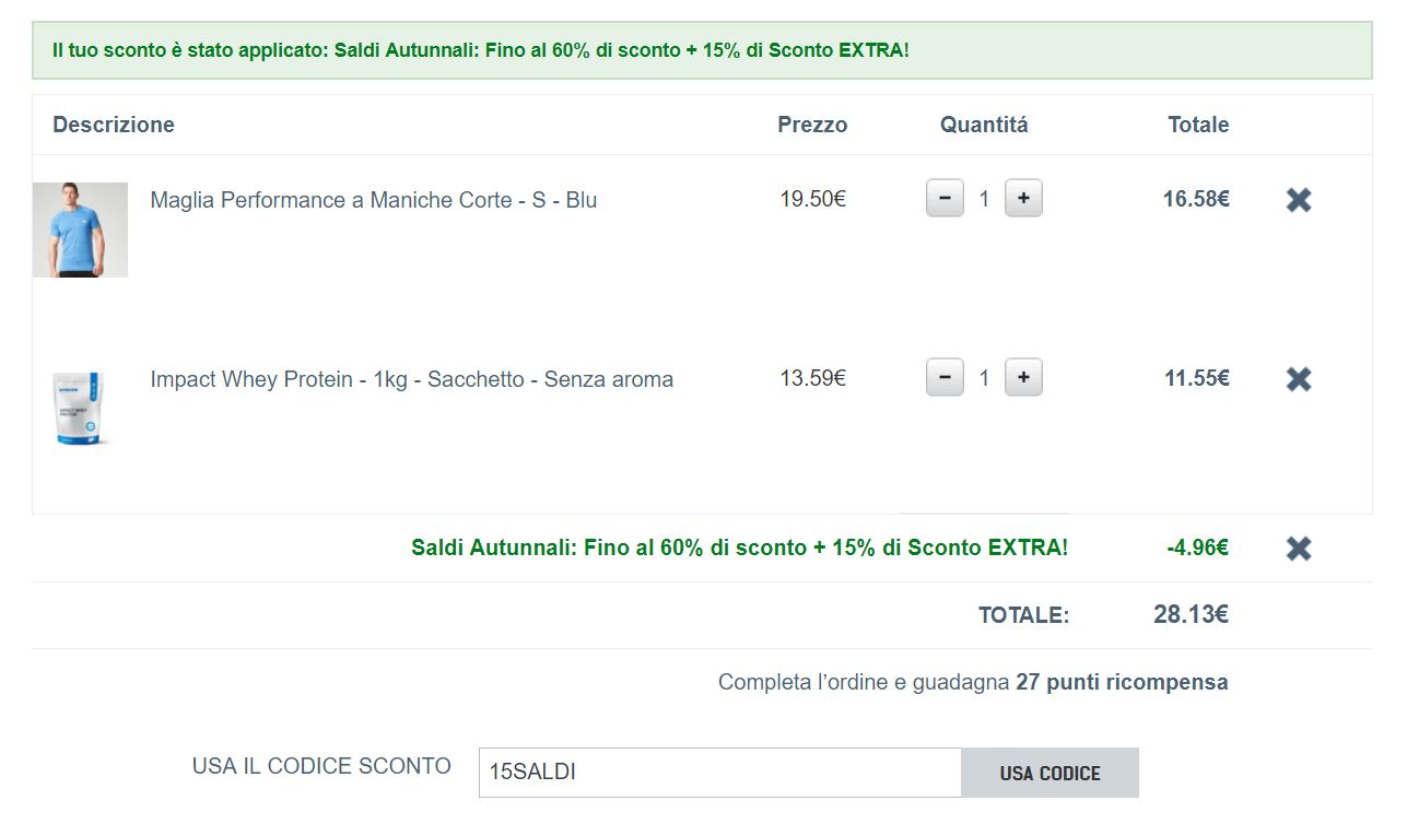 Qui sotto trovate un esempio di applicazione del codice sulla maglia Performance e sull’Impact Whey Protein da 1 KG!