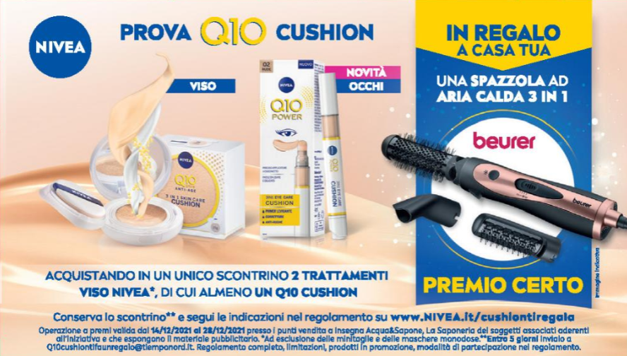 Per partecipare all’iniziativa è richiesto l’acquisto di 2 trattamenti viso Nivea, di cui almeno un Q10 Cushion viso o Q10 Cushion occhi.