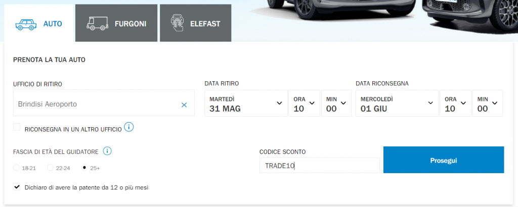 Una volta scelte le date di ritiro e riconsegna con i relativi orari, inserisci il codice sconto esclusivo TRADE10 promosso da Locauto (guarda foto).