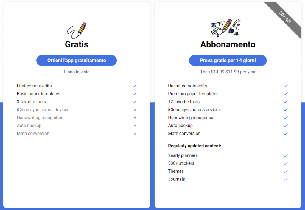 Il ben più corposo piano premium invece include anche la sincronizzazione delle note con iCloud, in modo da averne sempre un backup e potervi accedere da diversi dispositivi, template premium, ben 12 strumenti preferiti, riconoscimento della scrittura a mano, e persino la conversione matematica. Il tutto per 11,99$ 14,99$ all’anno.