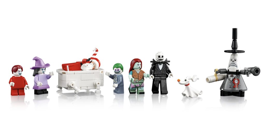Il giocoso set include anche 8 minifigure: Jack Skellington, Sally, Babbo Natale, Vado, Vedo e Prendo, il cane Zero e il sindaco a 2 facce.