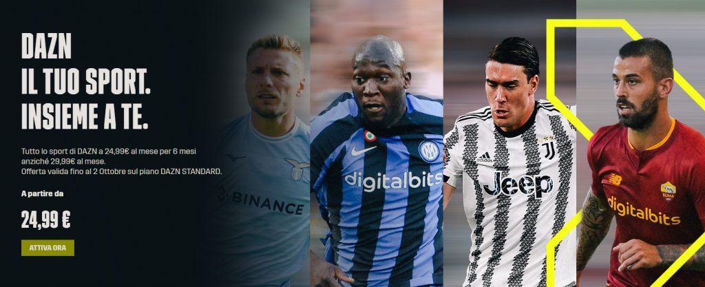 Aderendo all’iniziativa (attiva fino al 2 ottobre) potrai infatti attivare DAZN Standard al prezzo bloccato di 29,99€ 24,99€ per i prossimi sei mesi, andando così a risparmiare 5,00€ al mese.