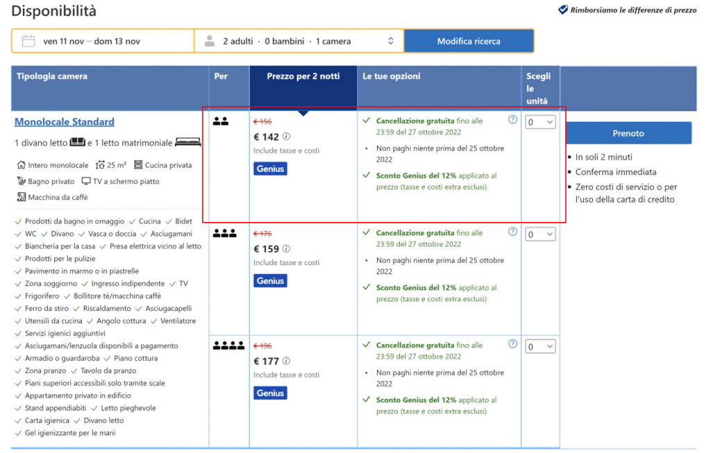 Esempio di offerta su Booking