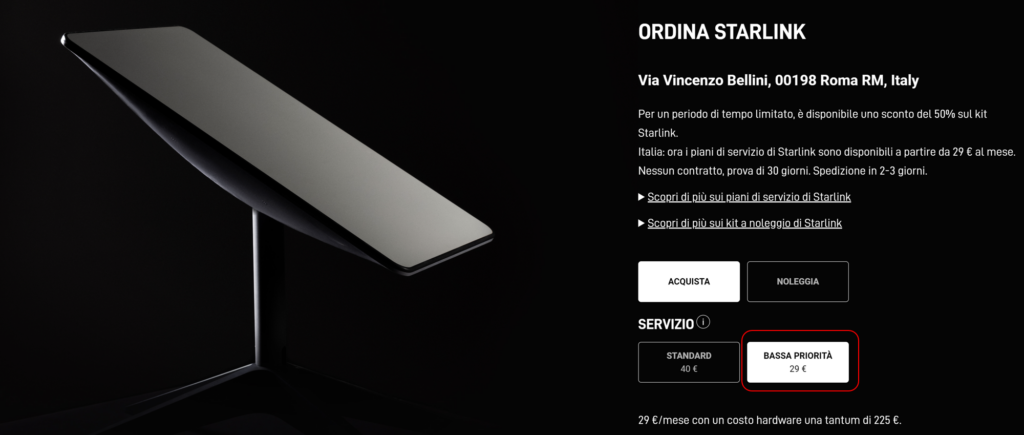 Starlink ha infatti lanciato un’offerta a tempo limitato in Italia, dimezzando il costo una tantum del kit e introducendo il nuovo piano a Bassa Priorità, che costa solo 29 euro al mese.