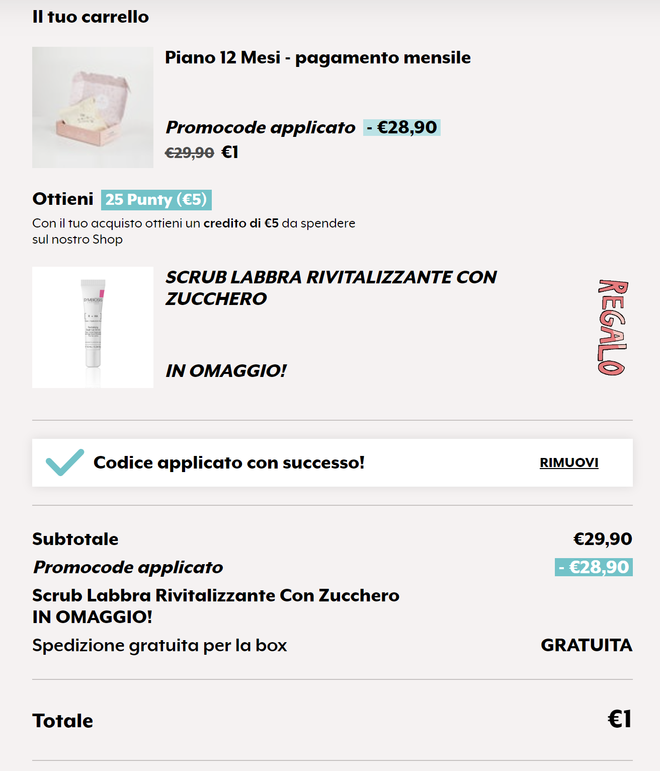 Al momento del pagamento troverai già applicata l’offerta e pagherai la tua prima box solo 1€.