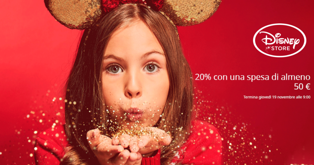 Solo fino a giovedì 19 novembre, Disney Store offre sul proprio catalogo online uno sconto del 20% sul carrello, a fronte di una spesa di almeno 50€.