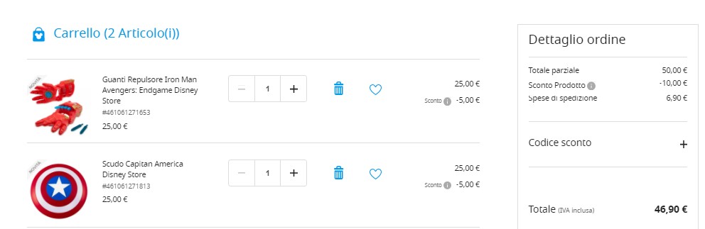 Raggiunti i 50€ di soglia minima, avrai il 20% di sconto su ogni articolo. Come vedi dallo screen sotto, abbiamo fatto un test aggiungendo al carrello due giocattoli Marvel come il guanto di Iron Man e lo scudo di Capitan America.