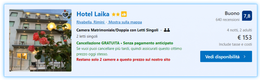 L’Hotel Laika offre camere singole, matrimoniali, doppie con letti singoli, triple e quadruple e a settembre l’offerta parte da solo 17€ a notte a testa (colazione esclusa, prezzo dal 15 al 19 settembre).