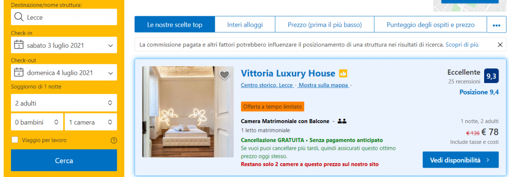 Il B&B scelto è una Casa di lusso, che offre camere matrimoniali con balcone privato, in pieno centro storico a Lecce. Si chiama Vittoria Luxury House, è situata a 400 metri da Piazza Mazzini e dispone anche di servizio di concierge e colazione all’italiana alla carta.