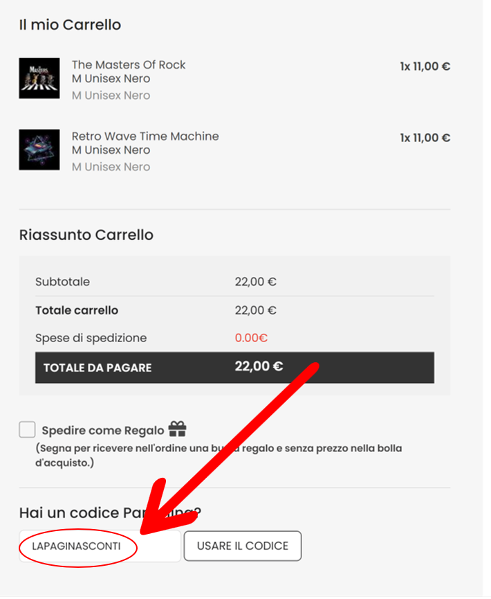 La foto di seguito mostra dove inserire il codice sconto LAPAGINASCONTI per assicurarti le calze in omaggio con la tua spesa di magliette Pampling in offerta.