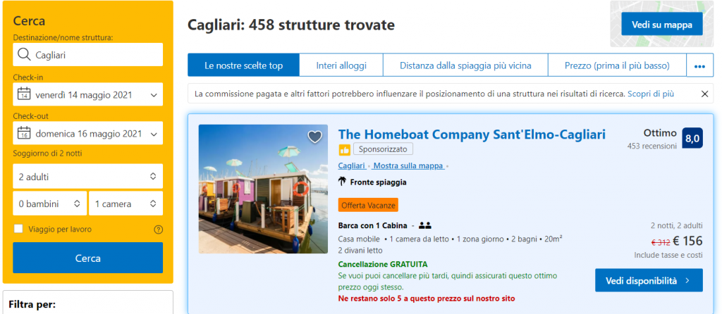 L’offerta di Booking per la casa galleggiante Homeboat Company Sant’Elmo-Cagliari a maggio, in offerta a tempo limitato.