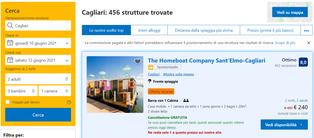 L’offerta di Booking per la casa galleggiante Homeboat Company Sant’Elmo-Cagliari a giugno, in offerta a tempo limitato.