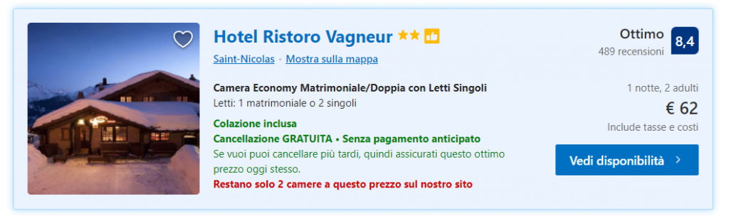 Perché ha vinto il Travellers’ Choice su Tripadvisor nel 2021, e perché a differenza di tanti altri Hotel, l’Hotel Ristoro Vagneur propone camera matrimoniali o doppie a prezzi molto interessanti e vantaggiosi anche nel periodo hot (si fa per dire) della Valle d’Aosta! Dicembre è nel pieno dell’alta stagione nelle vallate della Val D’Aosta e avere quindi un’offerta da soli 30-35€ a notte a testa (colazione inclusa) è davvero fantastico!