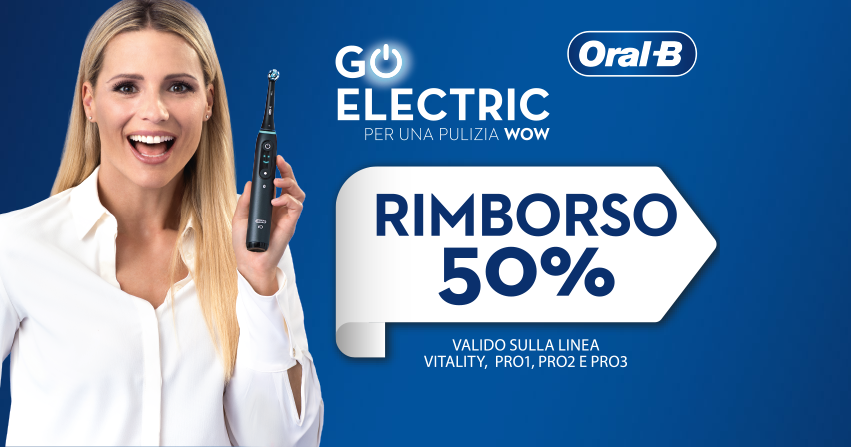 Dal 1° luglio al 30 settembre 2021, avrai diritto a richiedere il rimborso del 50% all’acquisto di uno spazzolino Oral-B in promozione, ovvero delle linee Vitality, PRO1, PRO2 o PRO3.
