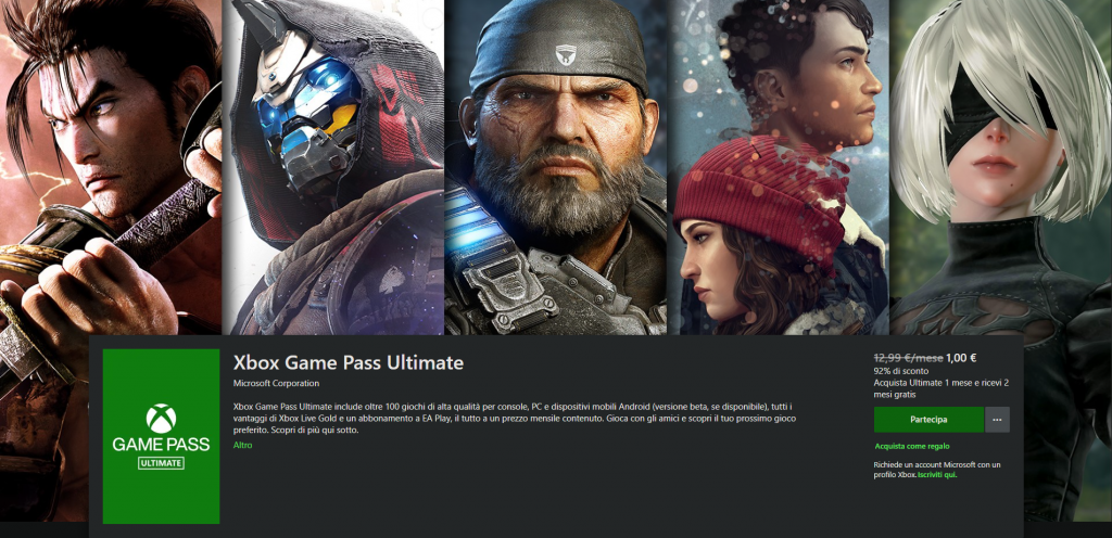 Solitamente l’Xbox Game Pass Ultimate ha un costo di 12,99€ al mese, ma grazie a questa promozione potrai acquistare 3 mesi di abbonamento a solo 1€ ed ottenere: