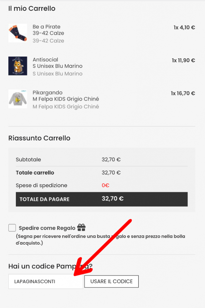 La foto di seguito mostra dove inserire il codice sconto LAPAGINASCONTI per assicurarvi le calze in omaggio con la vostra spesa di magliette Pampling.