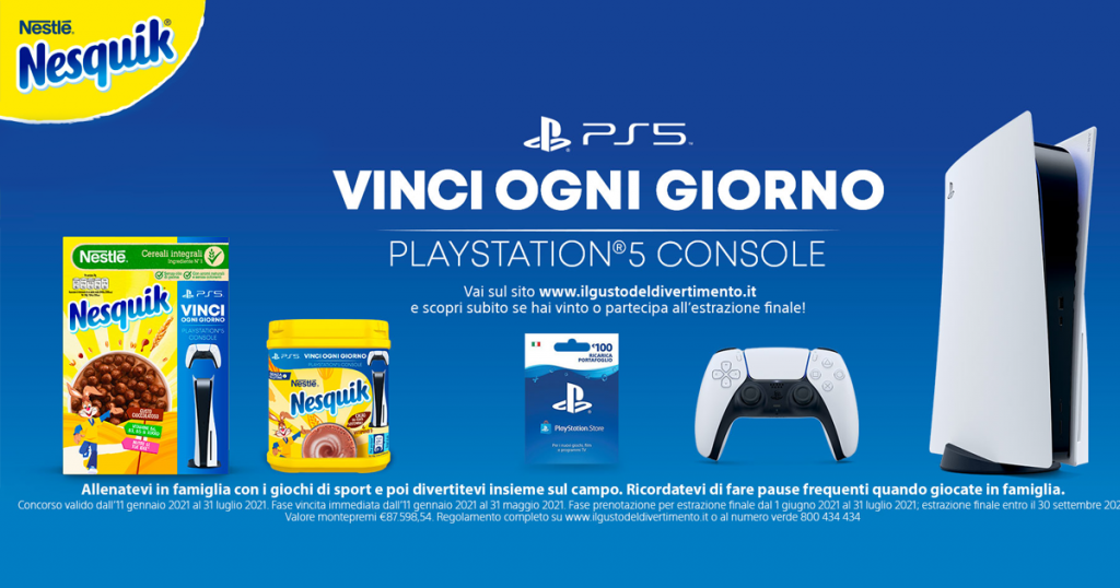Dall’11 gennaio al 31 maggio, acquistando i prodotti Nesquik puoi vincere immediatamente una delle cinque Playstation 5 messe in palio da Nestlé.
