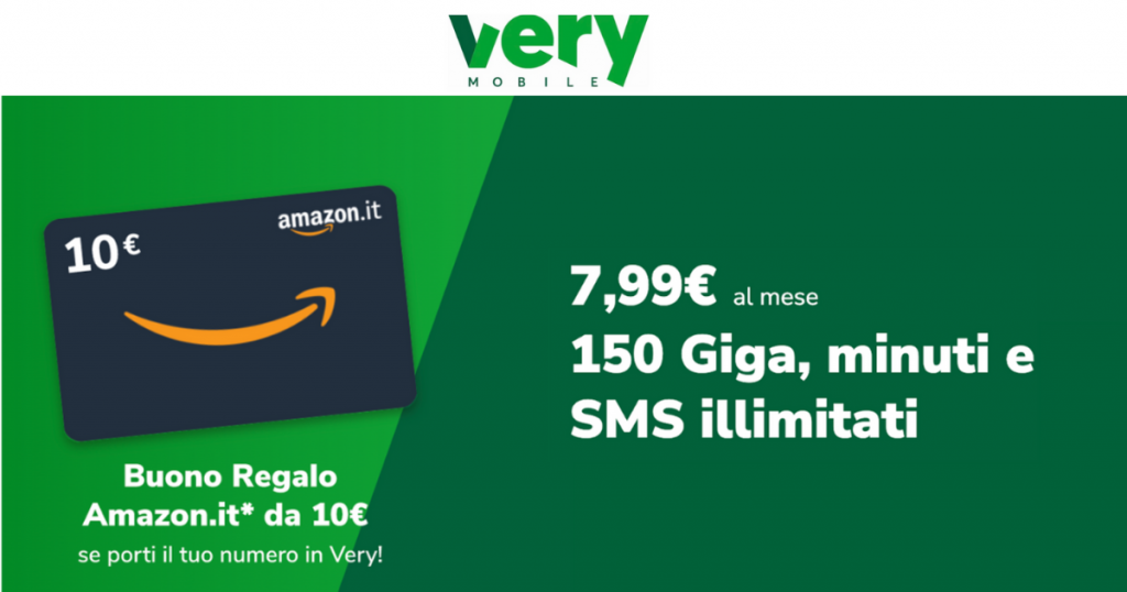 Si tratta di un’iniziativa rivolta solo a chi sceglie di portare il suo numero all’operatore Very Mobile. Nello specifico, il buono Amazon è destinato alle offerte in portabilità da Iliad, PosteMobile, CoopVoce, Fastweb e altri operatori mobili.