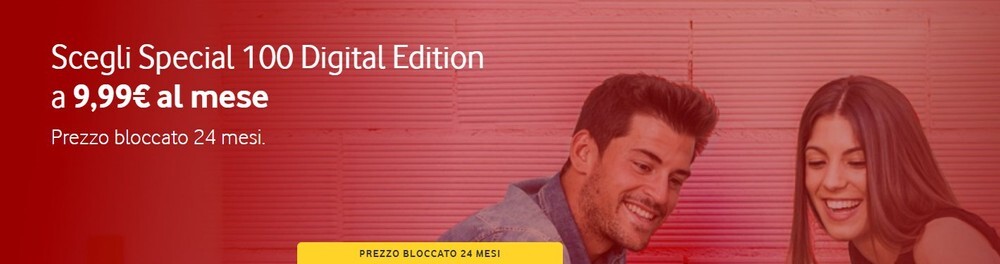 Il prezzo di Vodafone Special 100 Digital Edition è di 9,99€ al mese, con prezzo bloccato per i primi 24 mesi. L’addebito può essere fatto su credito residuo, carta di credito o addebito diretto su Conto Corrente.