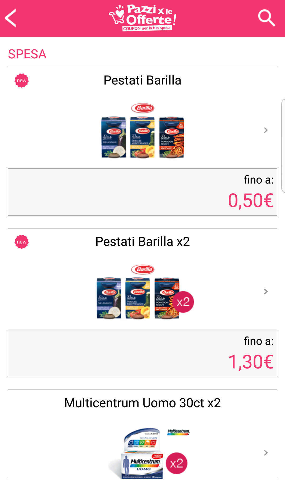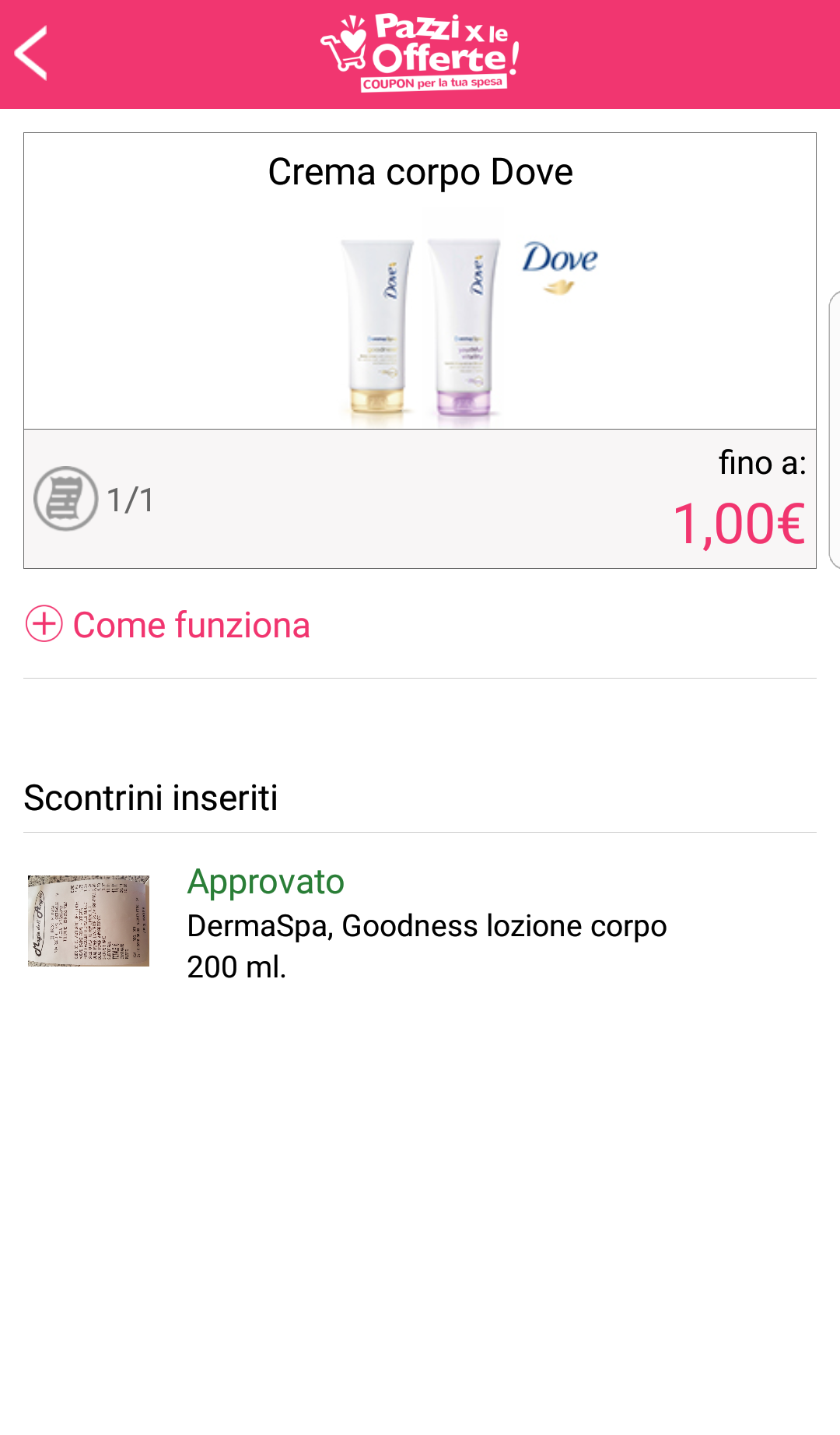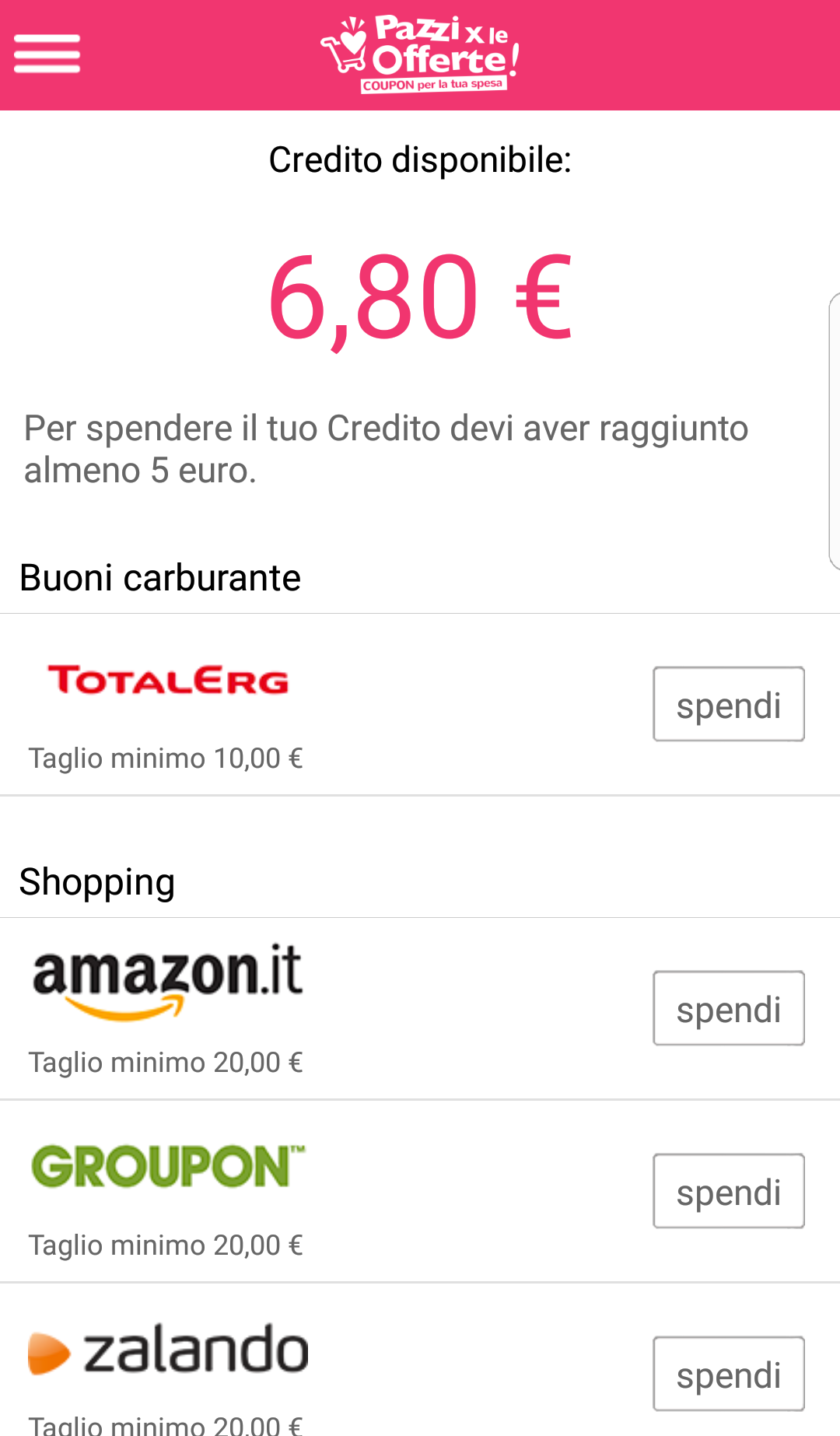 – Ad oggi potrete convertire il credito accumulato con “Pazzi per le Offerte” in buoni carburante Total Erg, in buono acquisto Amazon, Groupon, Zalando, Sisal, TicketOne, Eataly, in donazioni per “Pink is Good” e in ricariche telefoniche Tim, Vodafone, Wind e Tre.