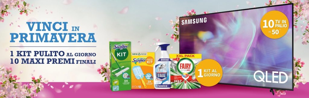 Rispondendo ad un semplice sondaggio avrai la possibilità di vincere 1 Kit Pulito al giorno (con prodotti Viakal, Swiffer e Fairy al suo interno) e 10 Smart TV Samsung da 50” ad estrazione finale!