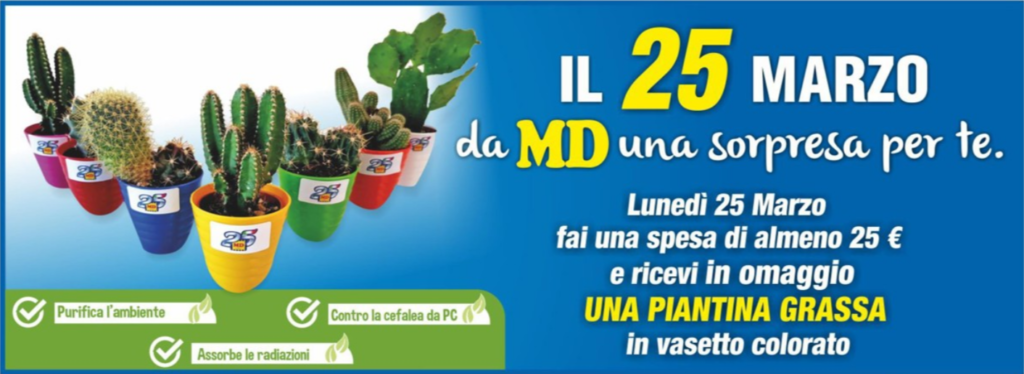 Recati presso uno dei tantissimi punti vendita e, con una spesa di almeno 25€, ricevi una Pianta grassa in omaggio da MD!