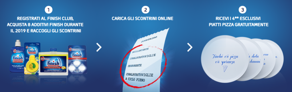 Di norma la promozione dà diritto a 4 Piatti da Pizza in omaggio, ma acquistando tutti gli 8 additivi Finish (necessari per effettuare la richiesta) da un punto vendita Acqua & Sapone, avrai diritto a ben 6 Piatti da Pizza anziché solo 4!