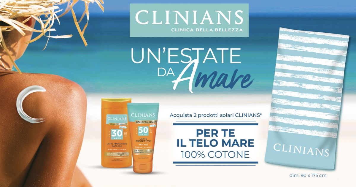 Acquistando 2 prodotti Solari a marchio Clinians, ottieni come premio certo un telo mare.