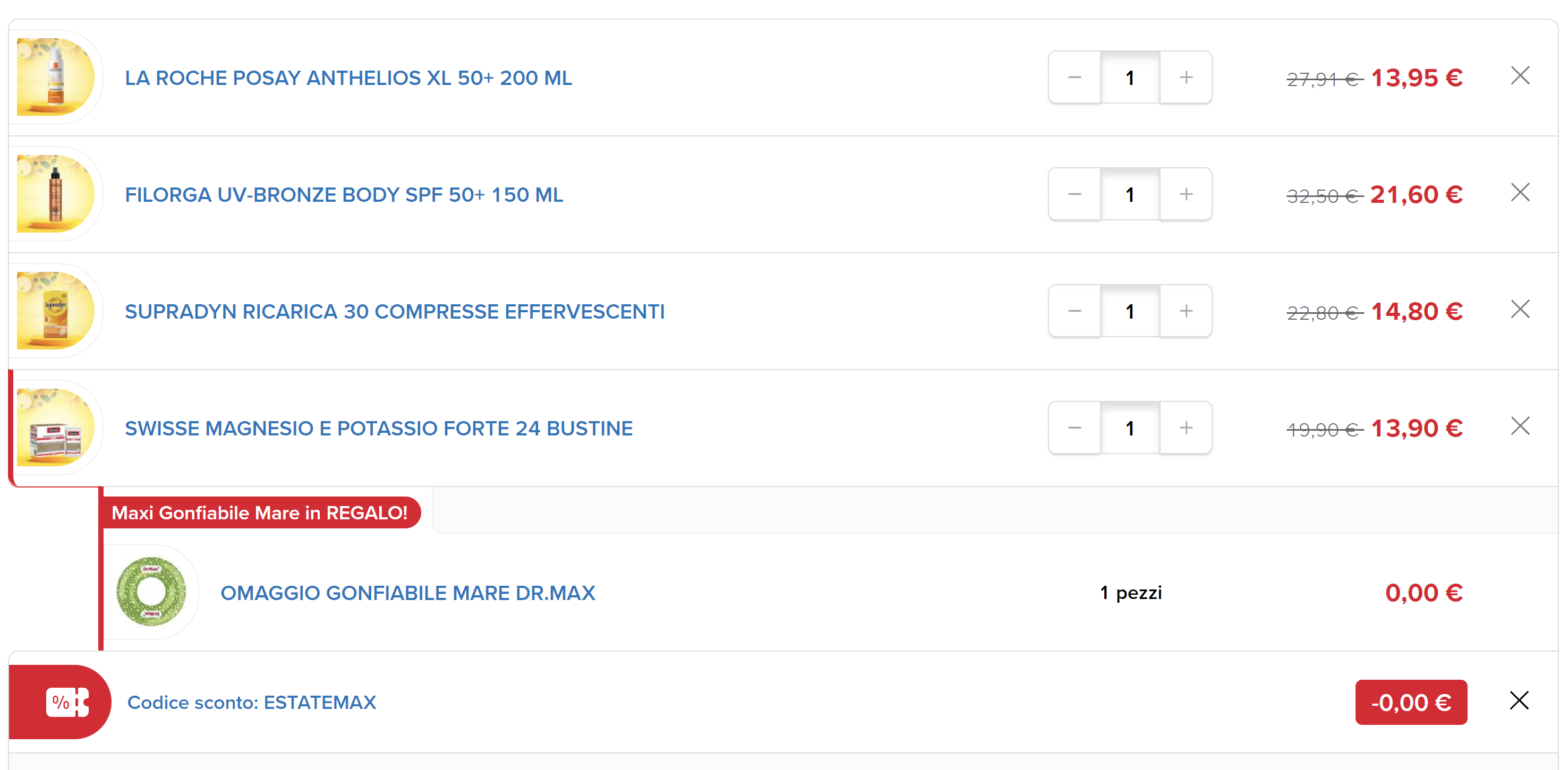 Fai scorta di prodotti con sconti fino al 50%. In più, fino al 28 agosto 2023, con una spesa minima di 49,90€, inserendo il codice sconto ESTATEMAX ottieni in regalo il maxi gonfiabile Dr.Max in pvc del valore di 2,60€!