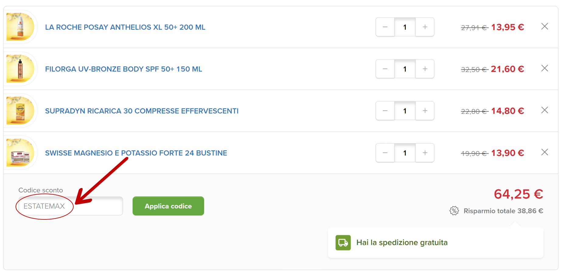Una volta terminata la spesa, vai quindi al carrello e inserisci il codice sconto ESTATEMAX nell’apposito spazio (come in foto).