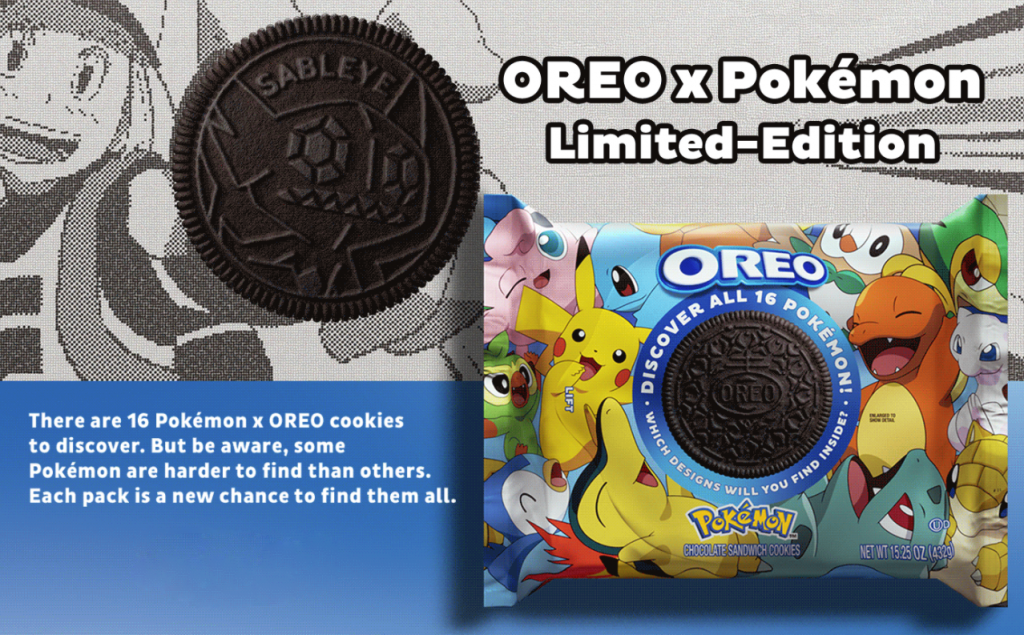 Questi biscotti speciali, nati dalla collaborazione tra i due importantissimi marchi e venduti solamente negli USA, raffigurano sulle due metà di cioccolato un Pokémon casuale, tra un ammontare di 16 diversi “mostri tascabili” tra i più amati di sempre.