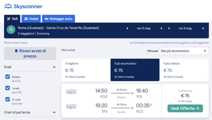 Esempio di offerta su SkyScanner