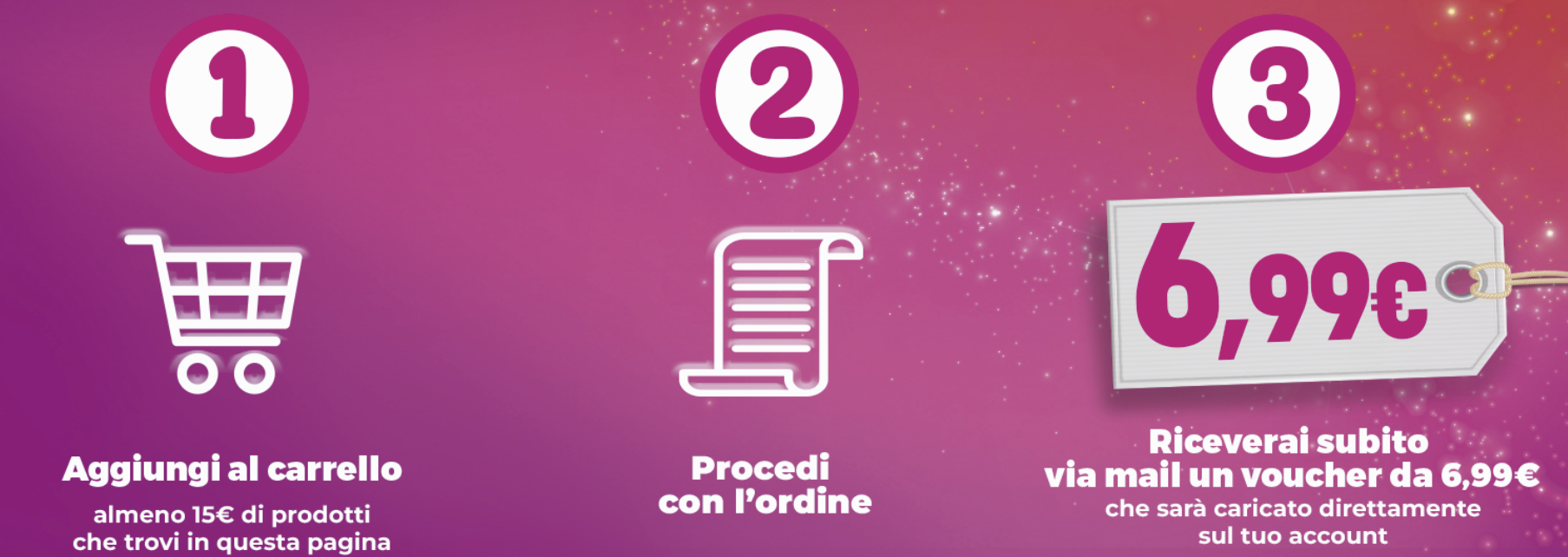 Aggiungi al carrello uno o più prodotti tra quelli in promozione fino a raggiungere la soglia minima di 15€.