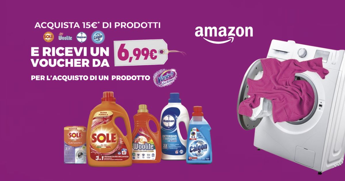 Acquista, in un unico ordine su Amazon, almeno 15€ di prodotti per il bucato a marchio Sole, Woolite, Napisan, Calgon a scelta tra quelli presenti sulla pagina web dedicata all’iniziativa.