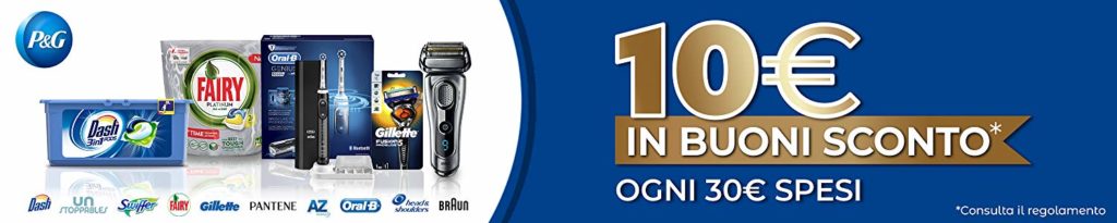 Amazon e P&G propongono un’interessante promo: spendendo almeno 30€ in prodotti dei marchi P&G, ricevi 10€ sotto-forma di buoni Amazon!
