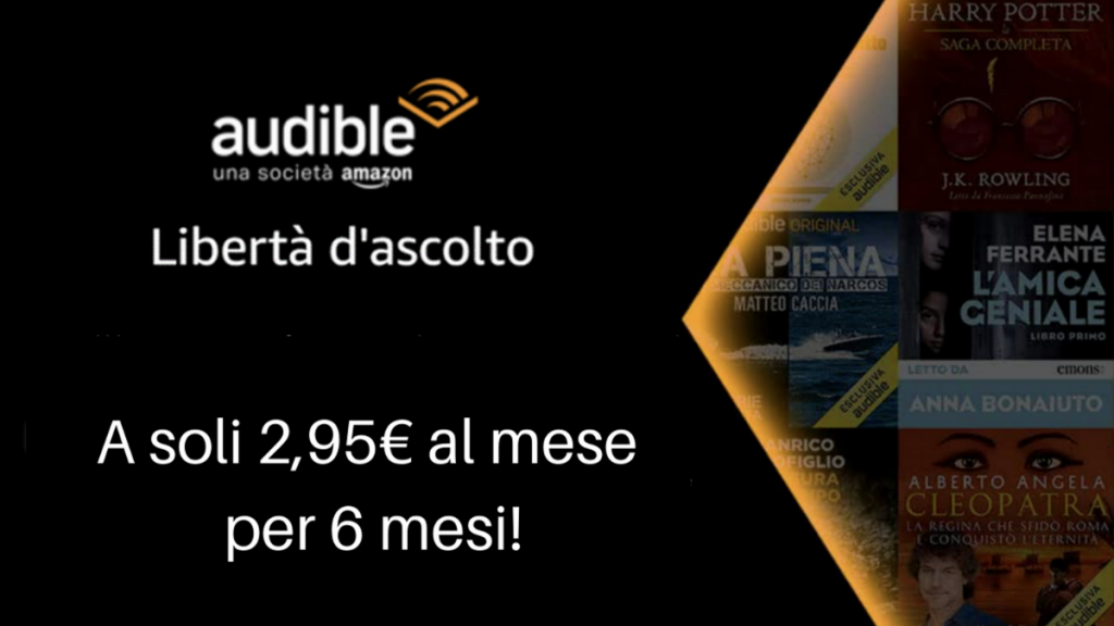 Sei amante di audiolibri e podcast? Non perdere altro tempo e non lasciarti sfuggire la super promo di Audibleiscriviti ora e sottoscrivi l’abbonamento al servizio a soli 2,95€ al mese per 6 mesi.