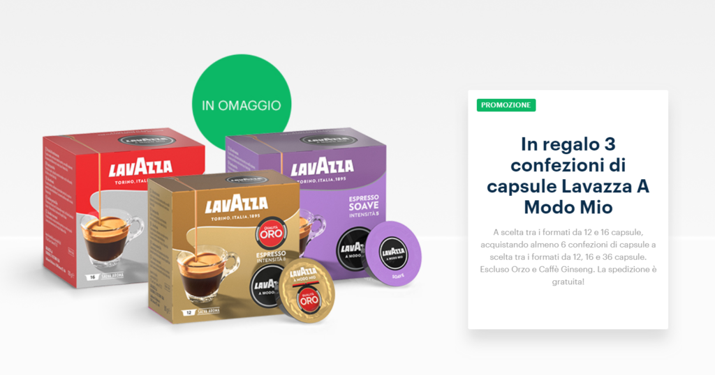 Infatti, acquistando da qui 6 confezioni di capsule Lavazza “A Modo Mio”, potrai sceglierne altre 3 in omaggio!