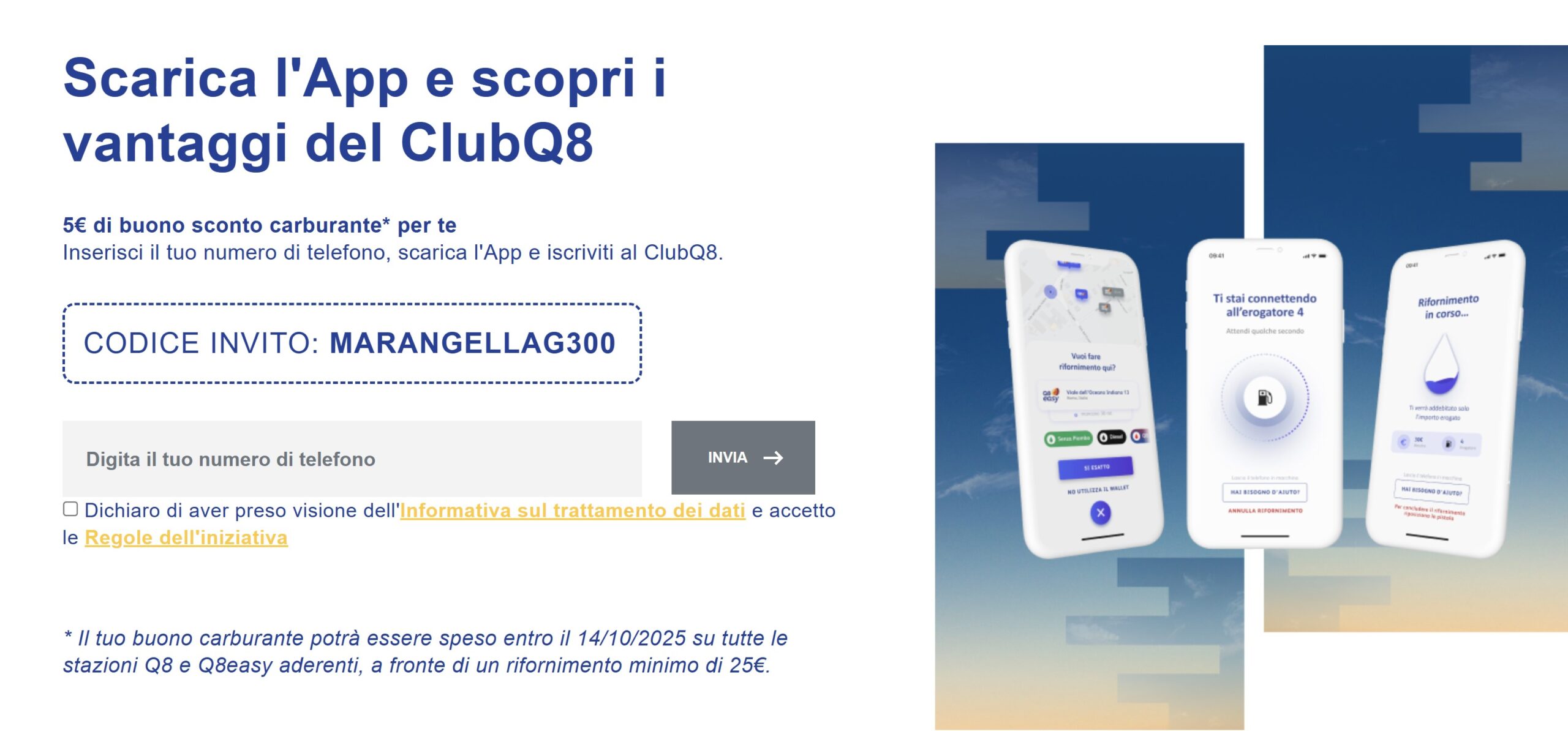 Per riscattare il primo coupon ti basterà iscriverti al ClubQ8, dopodiché riscatta il secondo buono carburante inserendo il tuo numero di cellulare nella pagina web dedicata e usando il codice invito MARANGELLAG300.