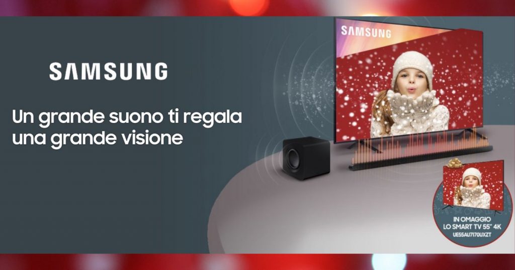 Natale si avvicina e Samsung lancia una super promozione: fino al 1° gennaio 2023 puoi ricevere GRATIS una smart TV 55 pollici 4K del valore di 449 euro con l’iniziativa “Un grande suono ti regala una grande visione”!
