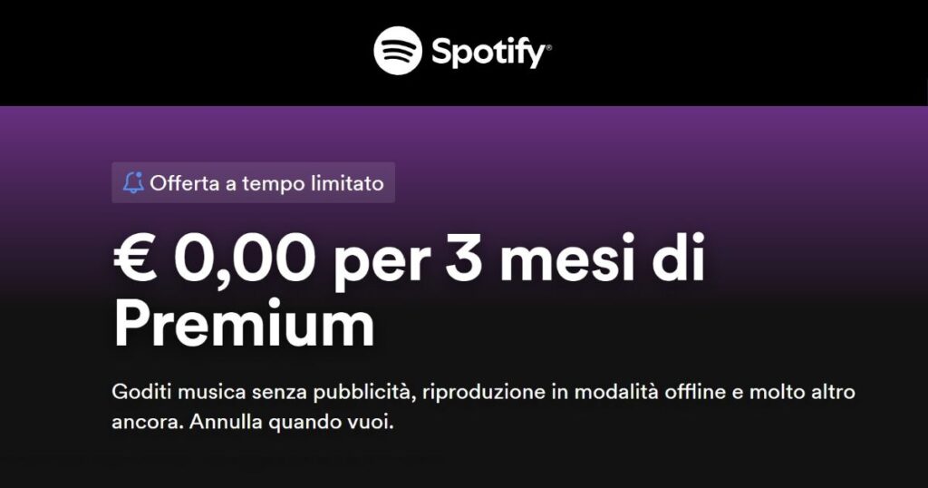 Spotify infatti ha annunciato un’imperdibile promozione: i primi 3 mesi puoi provare la versione Premium gratis, invece di pagare la consueta tariffa mensile di 10,99€! La promozione è però valida solo con il piano Individual.