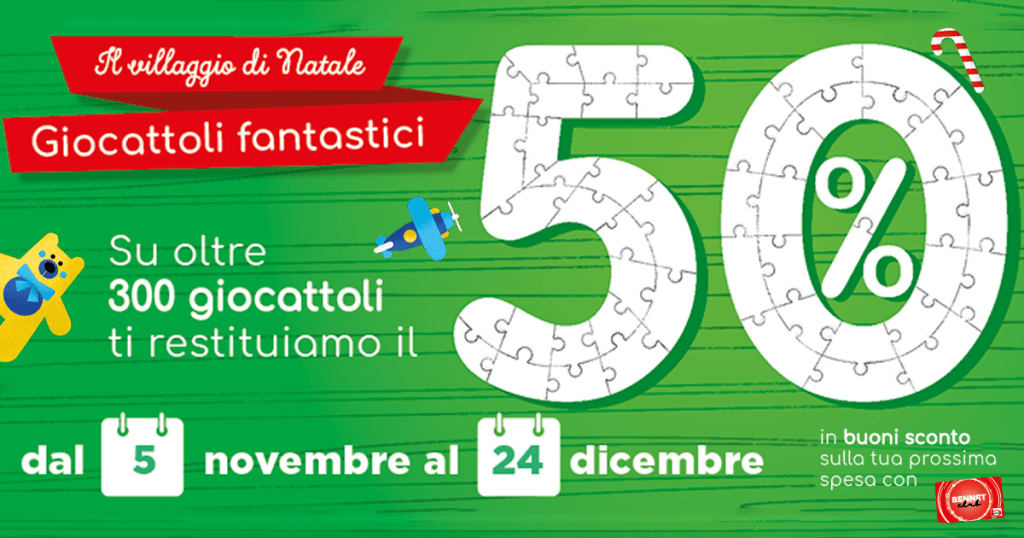 Dal 5 novembre al 24 dicembre 2020, aderisci alla promozione di Bennet su oltre 300 giocattoli, e ricevi alla cassa un buono del 50% del valore di acquisto!
