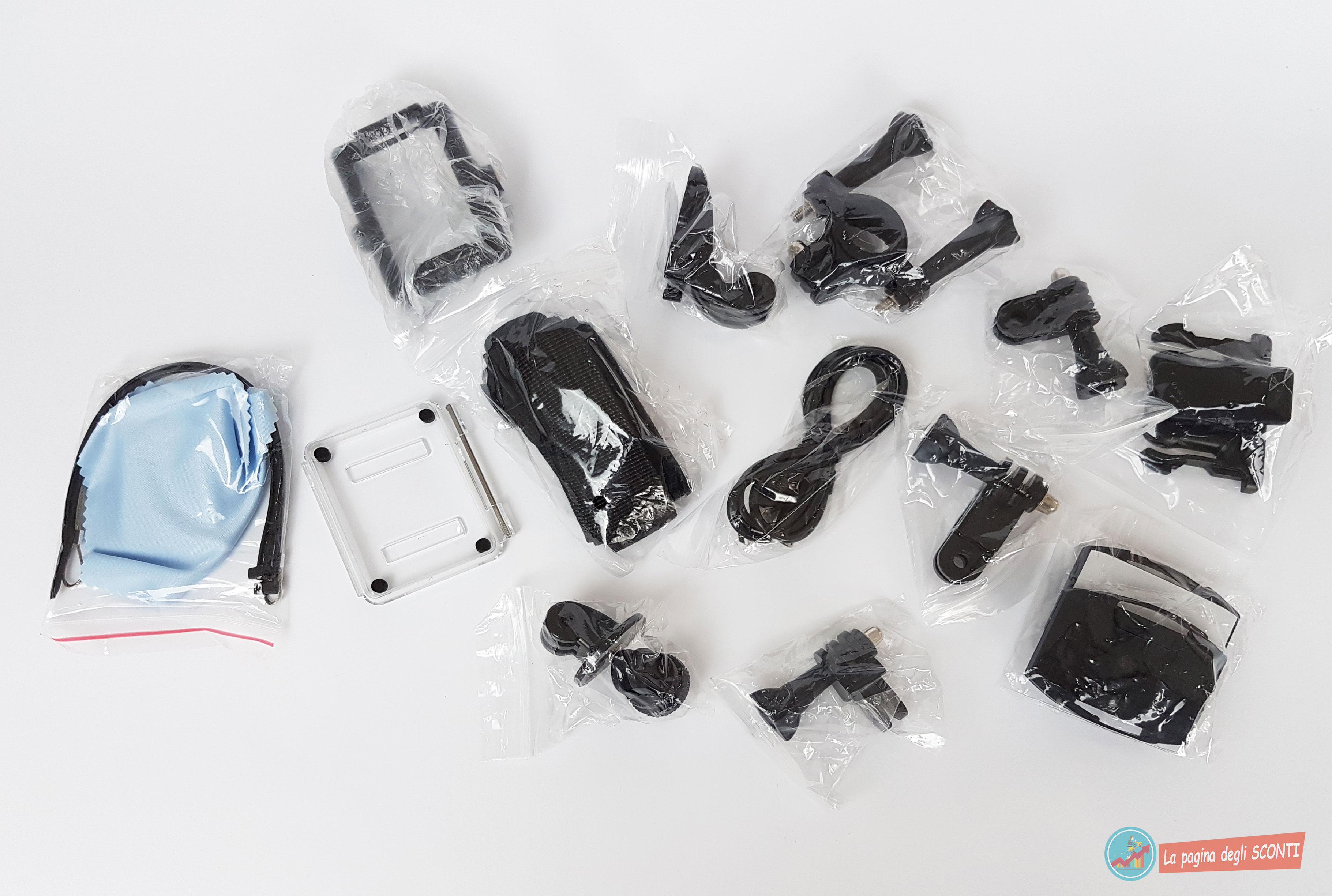 La confezione risulta molto curata e robusta, al suo interno oltre la cam troviamo lo scafandro per immergere il prodotto nell’acqua e moltissimi accessori che andranno usati in base allo sport che andremo a praticare.