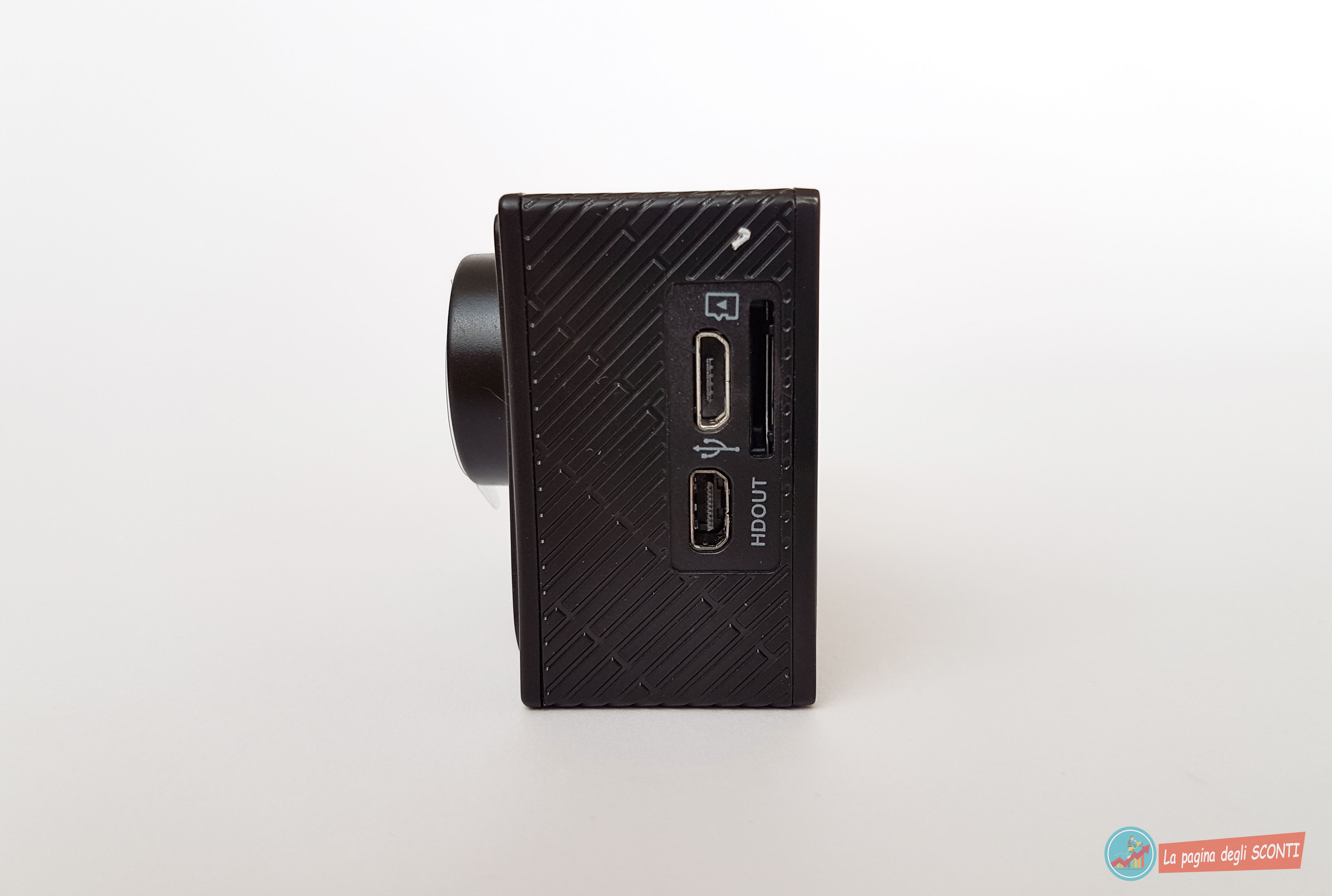 I tasti e gli ingressi che troviamo su questa action cam sono molteplici, sul lato destro abbiamo un’entrata per inserire la nostra micro SD e quindi andare a registrare i nostri video al suo interno, un ingresso micro USB per andare a ricaricare il prodotto e collegarlo al PC ed infine una porta micro HDMI.
