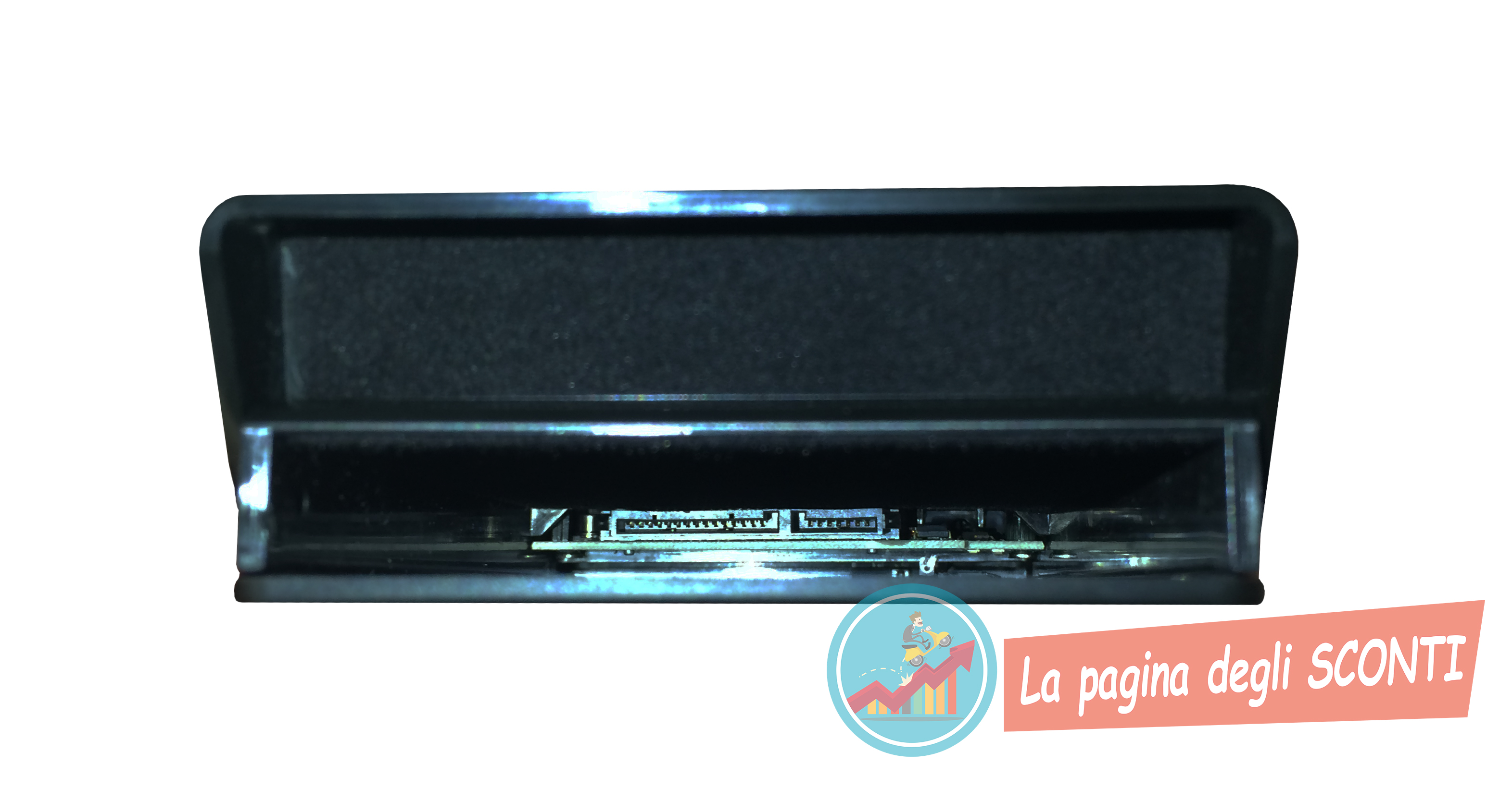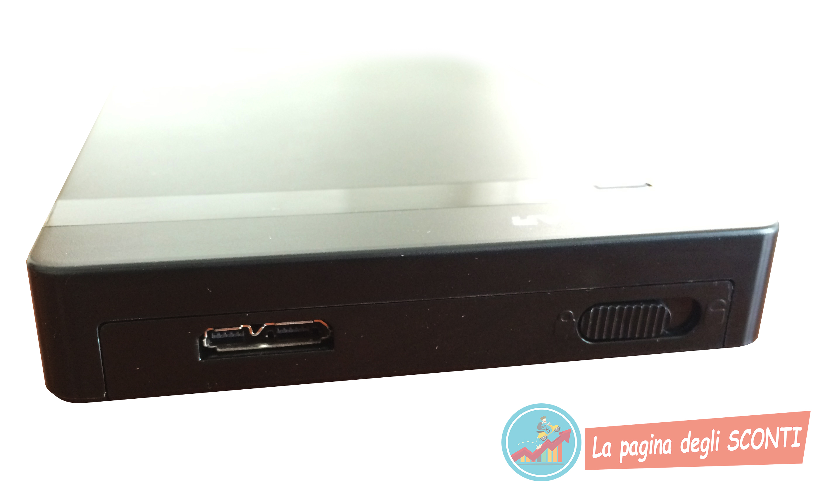 Nella parte frontale troviamo uno switch per bloccare/sbloccare la slitta che ci consentirà di inserire il nostro HDD. Dall’altro lato sempre nella parte frontale abbiamo invece l’entrata USB 3.0 di tipo B.