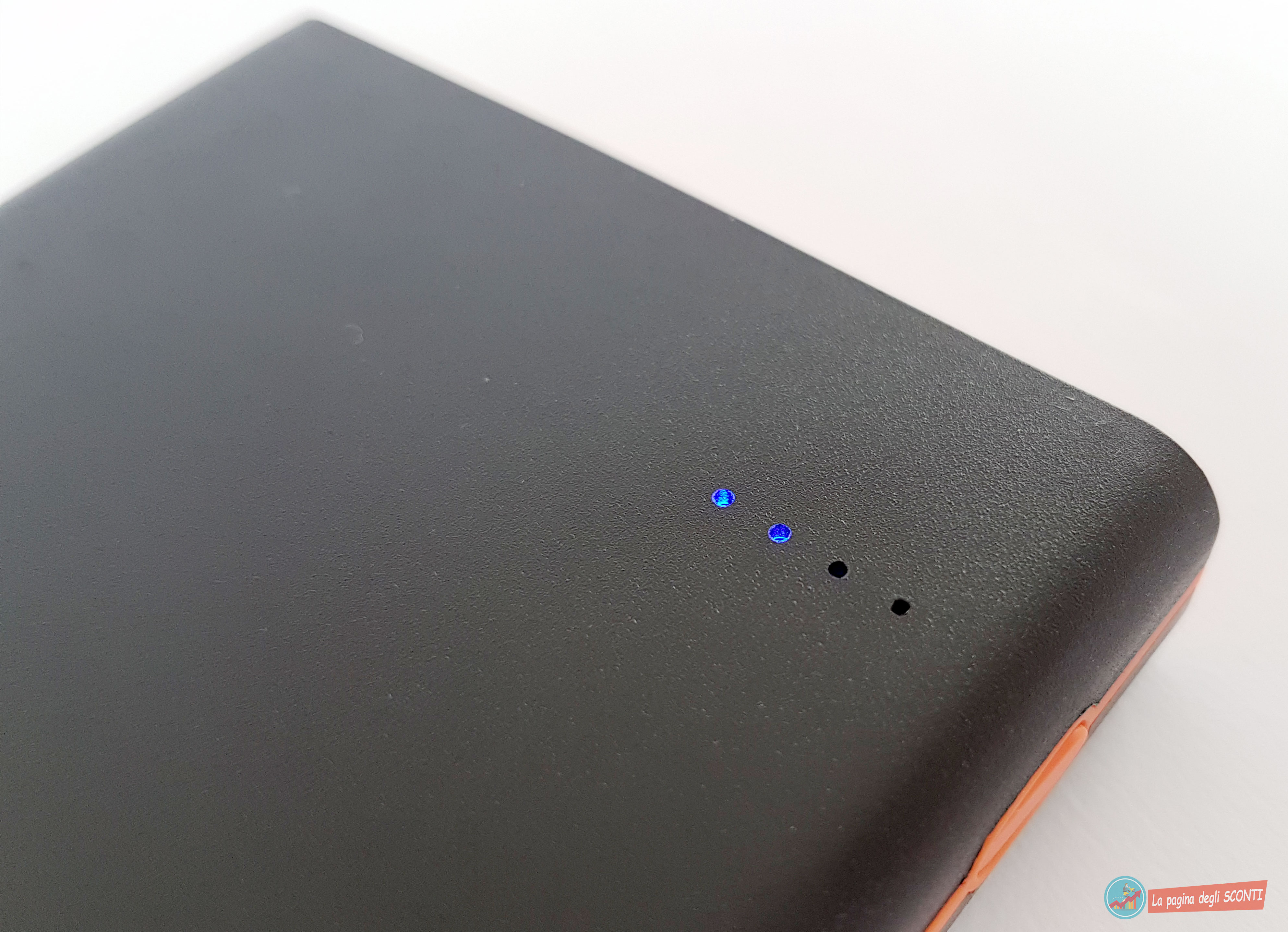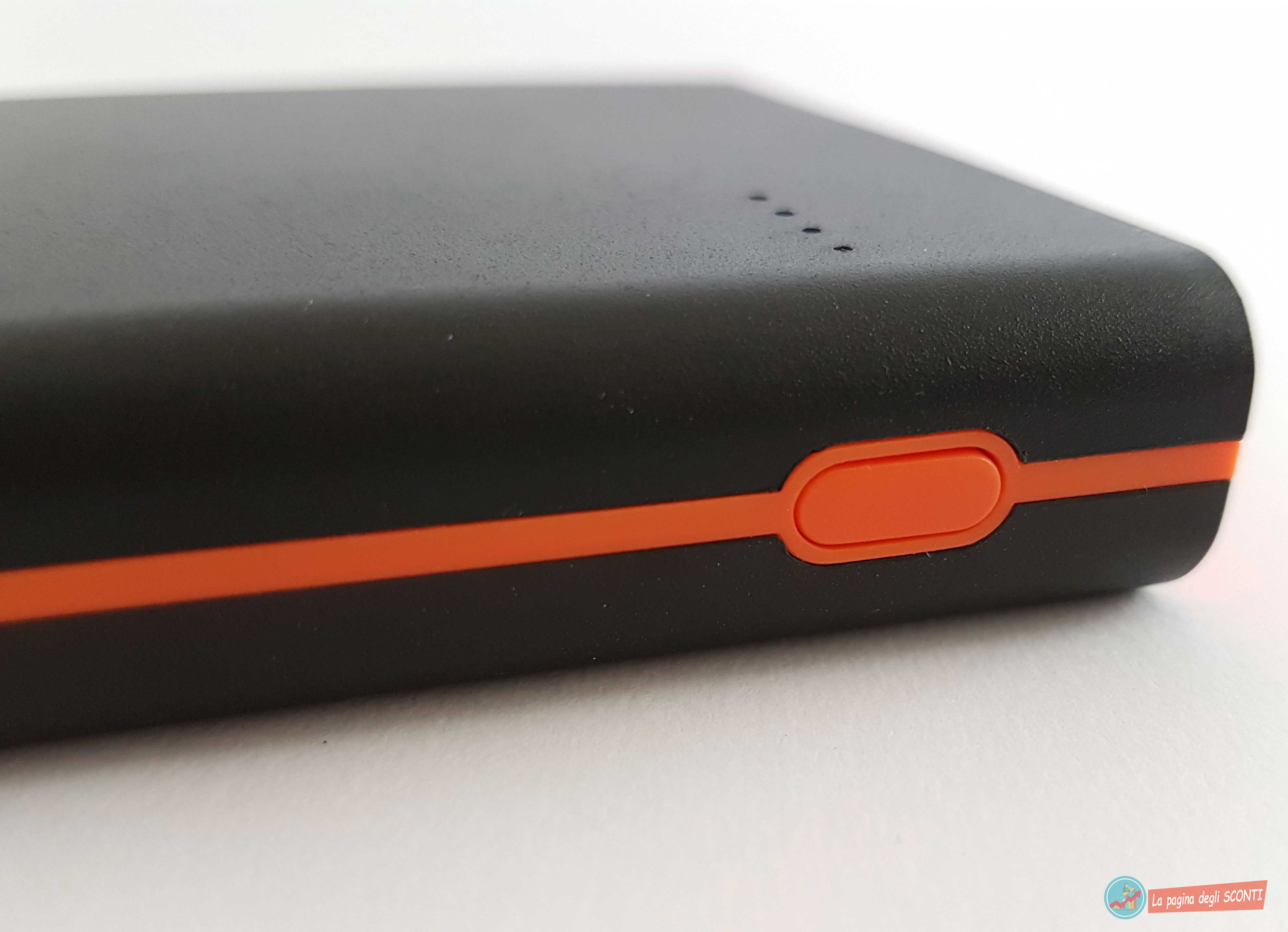 Per monitorare la quantità di energia residua nel power bank vi è un tasto posto lateralmente, che una volta premuto farà illuminare 4 LED posti sulla parte superiore ed in base al numero di “pallini” illuminati ci permetterà di capire la percentuale rimanente: