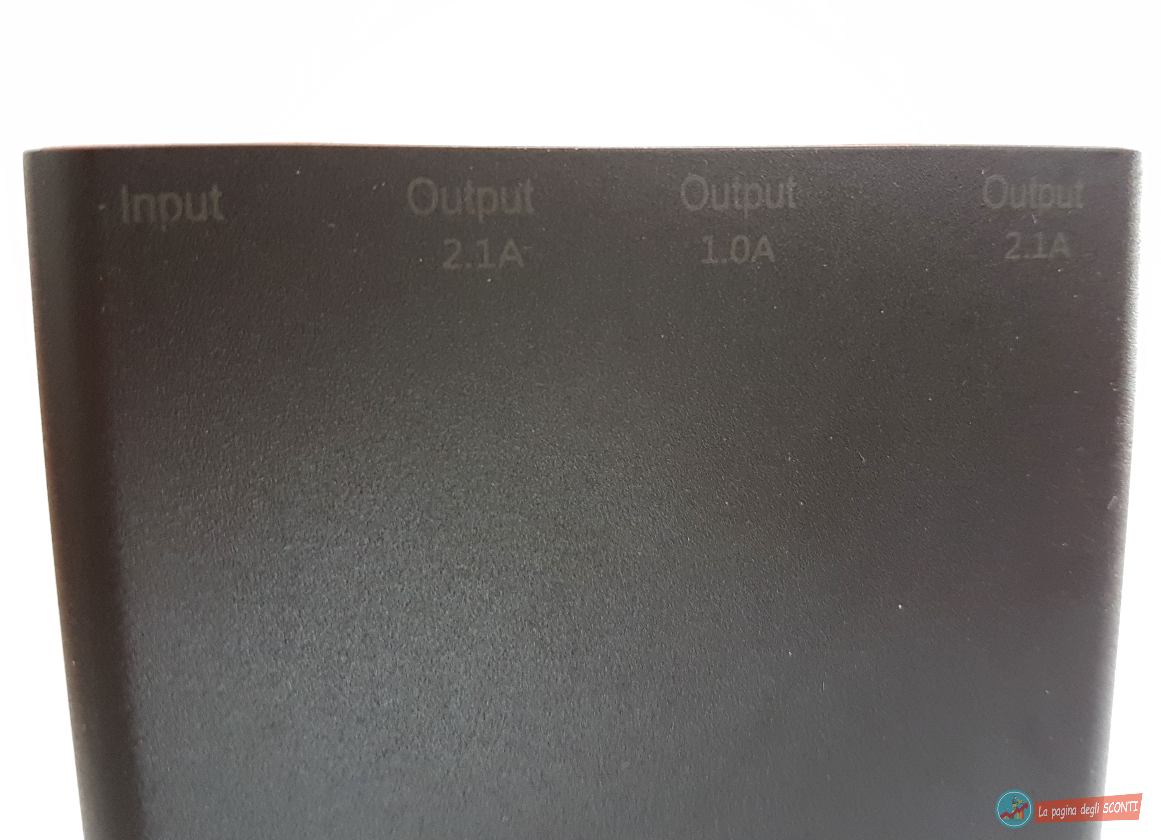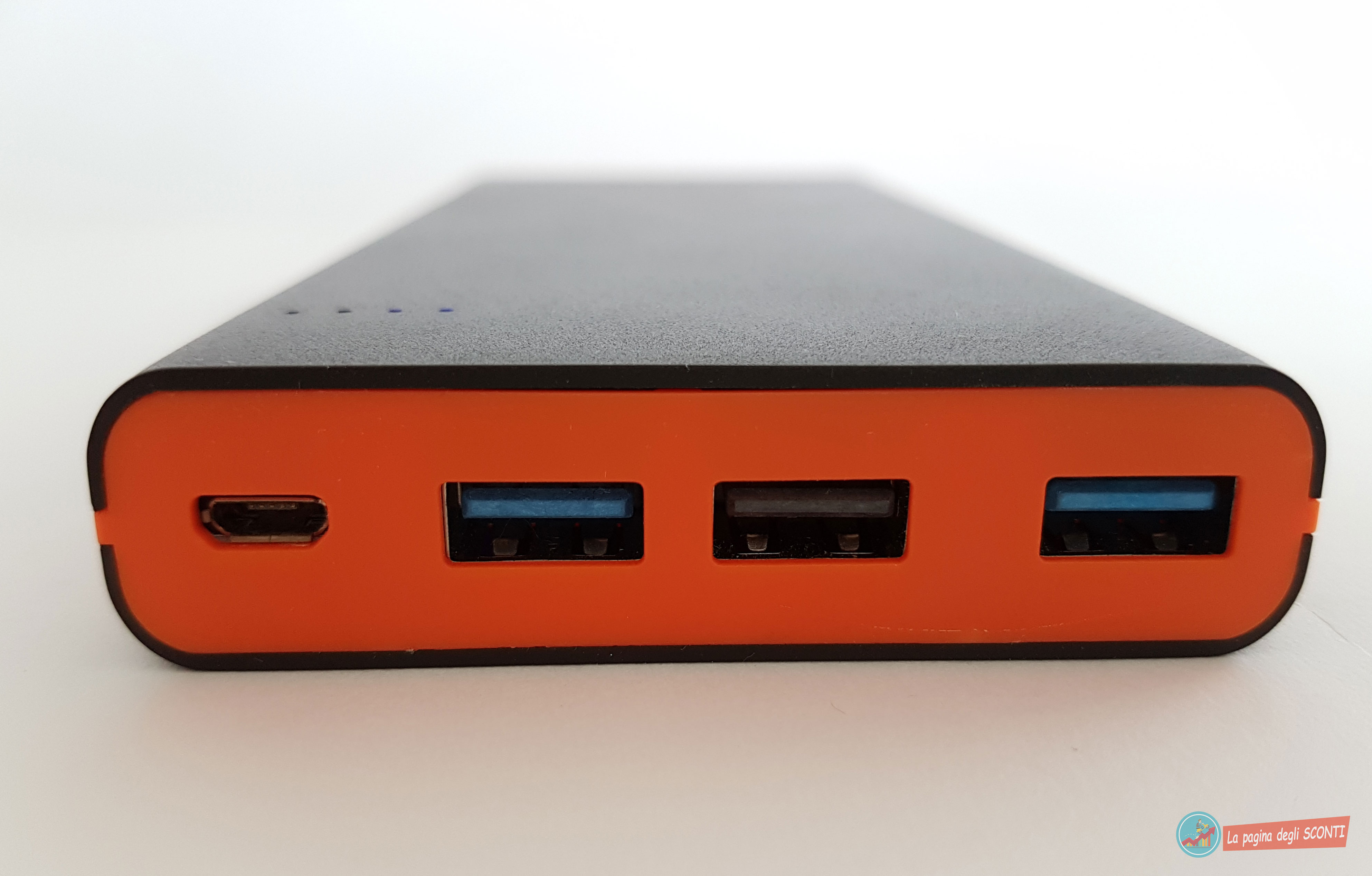 Sulla parte frontale della batteria troviamo 3 ingressi USB per la ricarica dei nostri device e uno micro USB per la ricarica della batteria stessa. Come per il modello meno capiente, troviamo che possedere diversi ingressi per la ricarica sia un vantaggio da non sottovalutare. Abbiamo infatti due ingressi blu che riescono ad erogare 2.1A di potenza ed una centrale di colore marrone che riesce ad erogare soltanto 1A.
