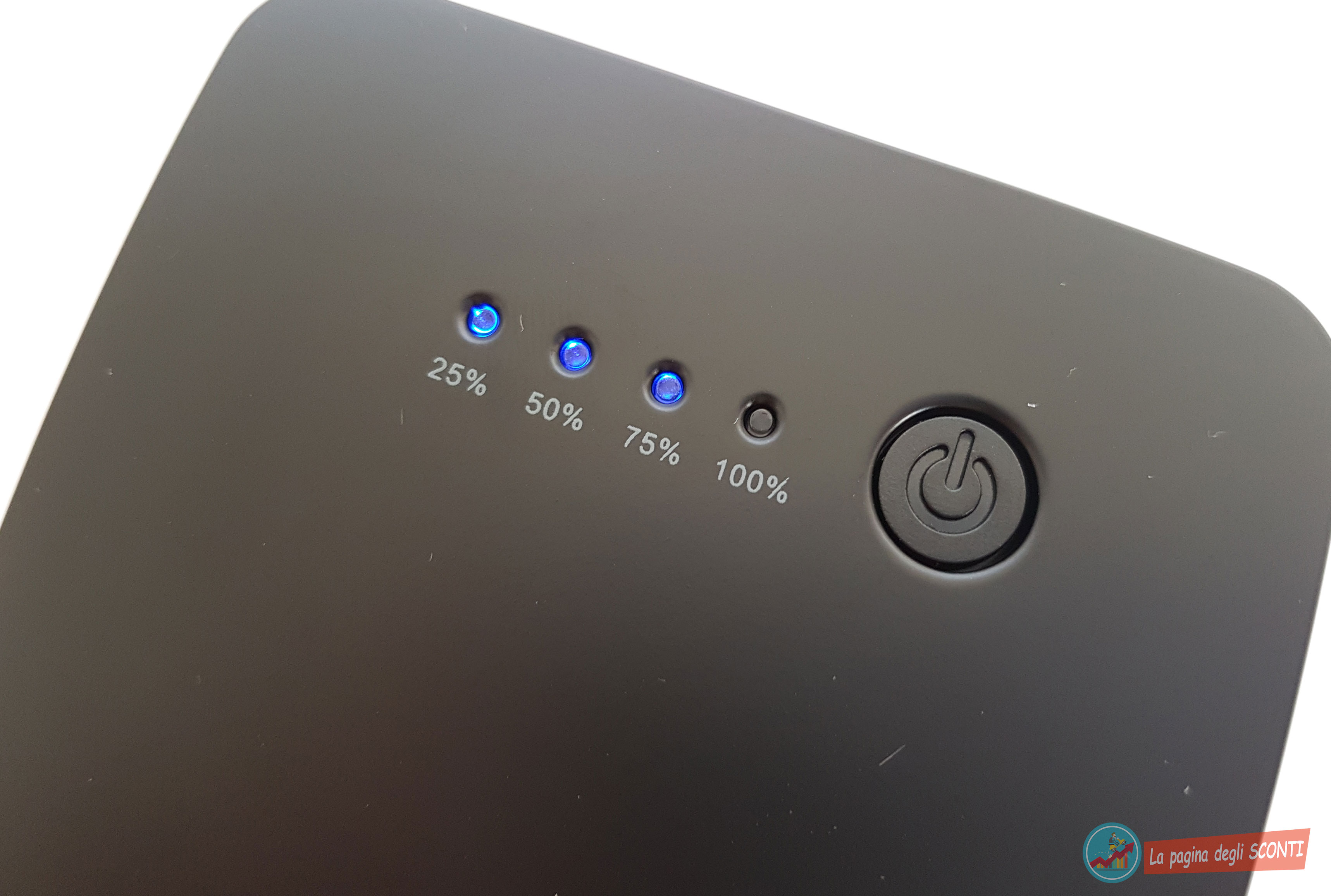 Per capire lo stato di carica residua all’interno del prodotto vi sono 4 LED posizionati nella parte superiore, ognuno con la relativa percentuale: 25%, 50%, 75% e 100%.