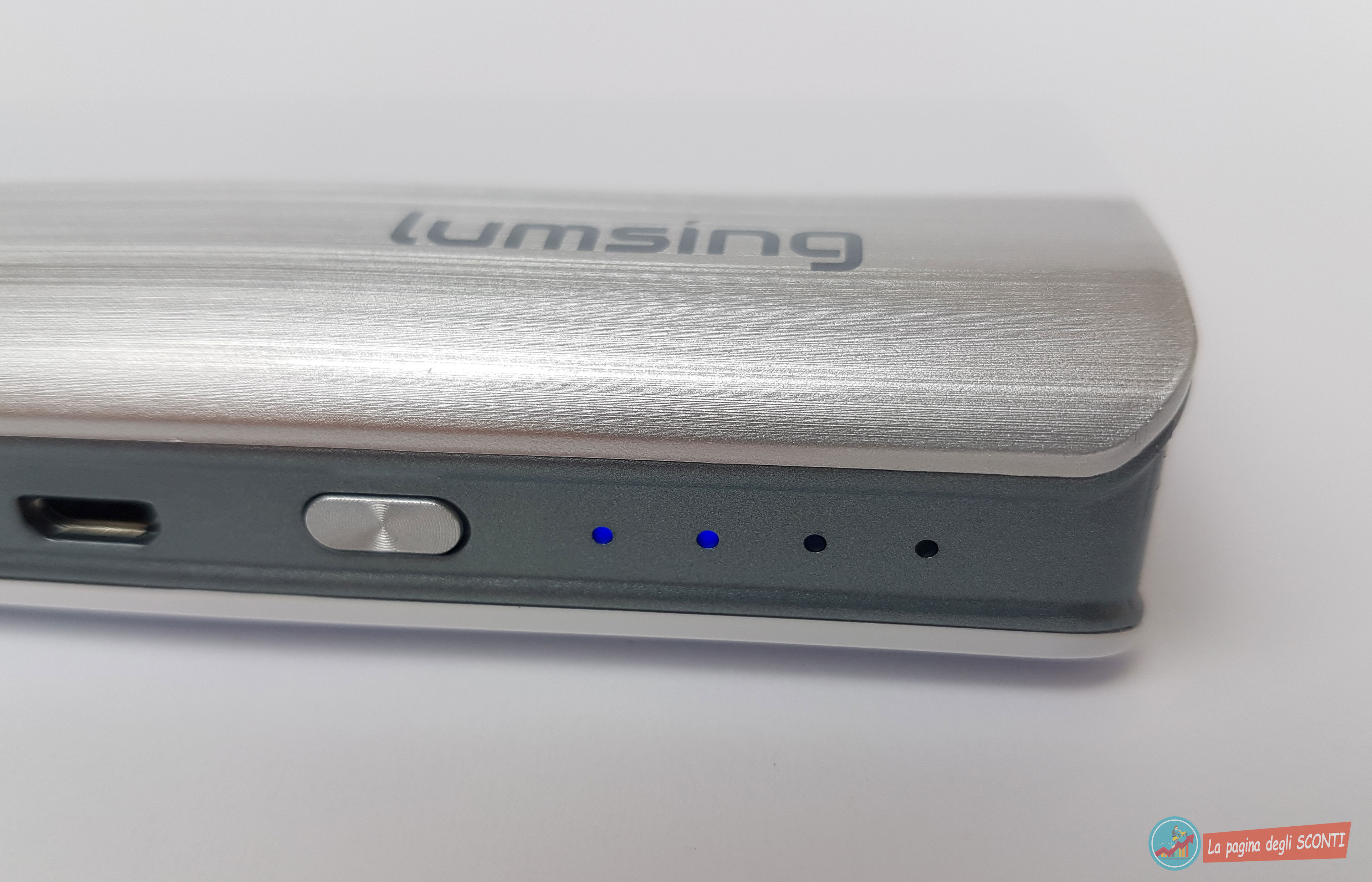 Sempre sul lato troviamo 4 LED che identificano lo stato di carica residua e il tasto power che ci servirà per avviare la carica dei dispositivi collegati.