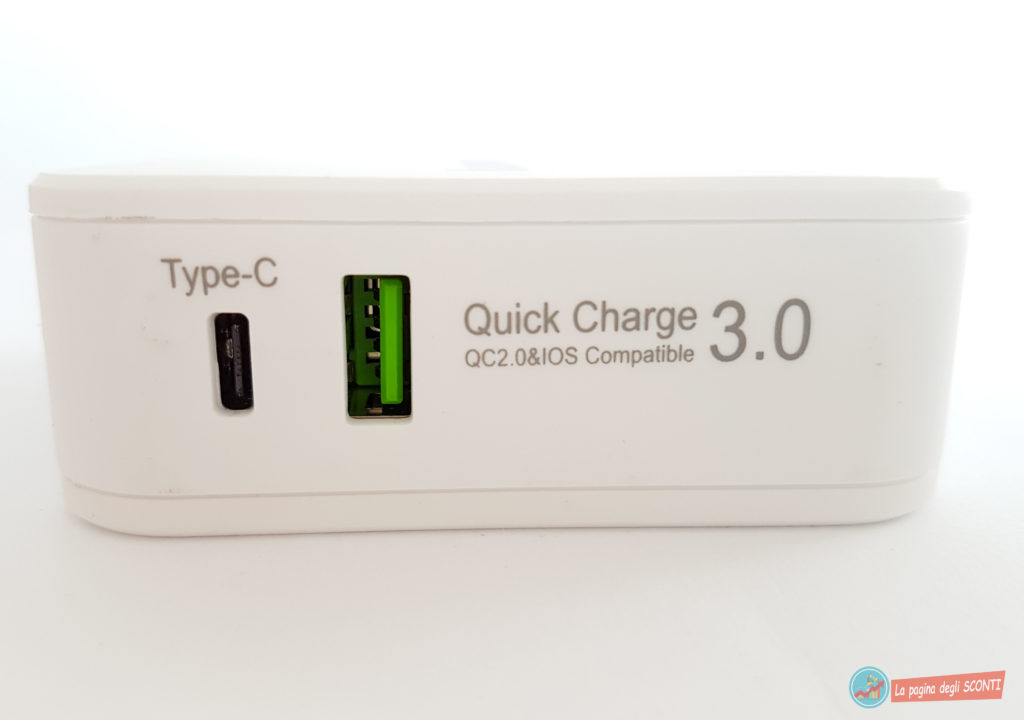 Sul lato del prodotto troviamo 2 entrate USB che ci consentiranno di caricare contemporaneamente device che posseggono la tecnologia QC 3.0/2.0 e dispositivi che adottano il nuovo standard Type-C.