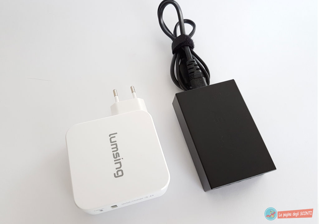 Visto che abbiamo menzionato le misure di questo articolo, vorremmo mostrarvi un confronto con un’altro caricabatterie che a differenza di questo marchiato Lumsing, offre più ingressi USB pur avendo delle dimensioni più compatte.